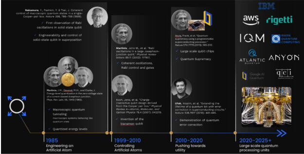 A timeline of milestones for the quantum processing unit. From a single spark in 1985, to an entire ecosystem